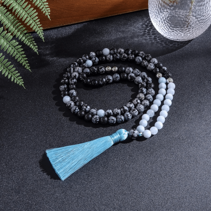 Dieses Schmuckset aus Aquamarin und Schneeobsidian vereint Eleganz und Geheimnis durch seine kontrastierenden Farben. Perfekt, um die Kommunikation anzuregen und Ihren Schutz im Alltag zu stärken.
