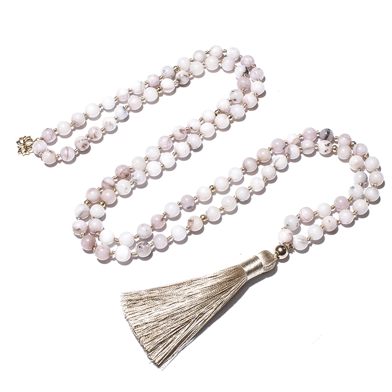 Die Mala, ein schützendes, spirituelles und tugendhaftes Schmuckstück, ist eine Gebetskette aus 108 Perlen , die ursprünglich von Buddhisten und Hindus zur Meditation und zum Gebet verwendet wurde. Ihre wachsende Beliebtheit hat sie nach und nach zu einem modischen Accessoire für den Alltag gemacht.